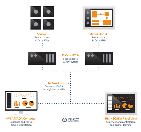 The basic SCADA architecture begins with programmable logic controllers (PLCs) or remote terminal units (RTUs). PLCs and RTUs are microcomputers that communicate with an array of objects such as factory machines, HMIs, sensors, and end devices, and then route the information from those objects to computers with SCADA software. The SCADA software processes, distributes, and displays the data, helping operators and other employees analyze the data and make important decisions.